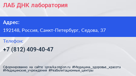 ЛАБ-ДНК, лаборатория по адресу 192148, Россия, Санкт-Петербург, Седова, 37 в дальнейшем Организация, размещена в следующих категориях: