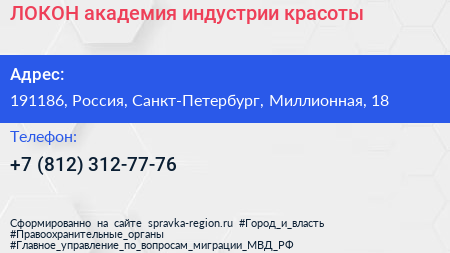 ЛОКОН, академия индустрии красоты по адресу 191186, Россия, Санкт-Петербург, Миллионная, 18 в дальнейшем Организация, размещена в следующих категориях: