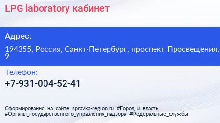 LPG laboratory, кабинет по адресу 194355, Россия, Санкт-Петербург, проспект Просвещения, 9 в дальнейшем Организация, размещена в следующих категориях: