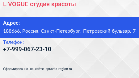L.VOGUE, студия красоты по адресу 188666, Россия, Санкт-Петербург, Петровский бульвар, 7 в дальнейшем Организация, размещена в следующих категориях: