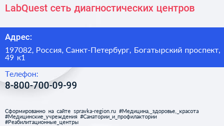 LabQuest, сеть диагностических центров по адресу 197082, Россия, Санкт-Петербург, Богатырский проспект, 49 к1 в дальнейшем Организация, размещена в следующих категориях: