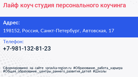 Лайф коуч, студия персонального коучинга по адресу 198152, Россия, Санкт-Петербург, Автовская, 17 в дальнейшем Организация, размещена в следующих категориях: