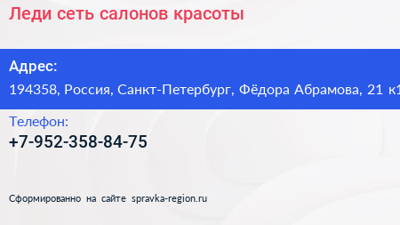 Леди, сеть салонов красоты по адресу 194358, Россия, Санкт-Петербург, Фёдора Абрамова, 21 к1 в дальнейшем Организация, размещена в следующих категориях: