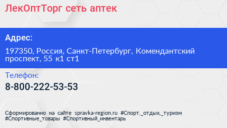 ЛекОптТорг, сеть аптек по адресу 197350, Россия, Санкт-Петербург, Комендантский проспект, 55 к1 ст1 в дальнейшем Организация, размещена в следующих категориях: