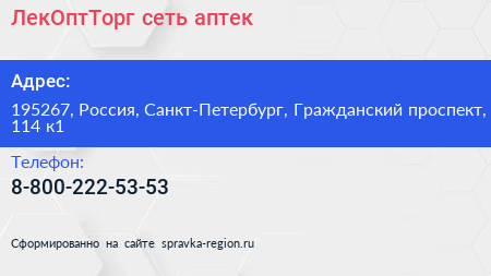 ЛекОптТорг, сеть аптек по адресу 195267, Россия, Санкт-Петербург, Гражданский проспект, 114 к1 в дальнейшем Организация, размещена в следующих категориях: