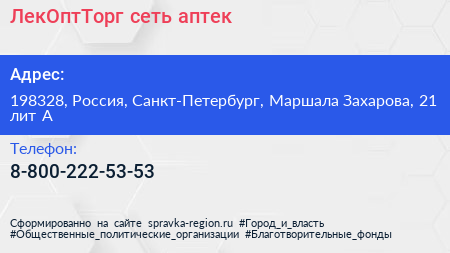 ЛекОптТорг, сеть аптек по адресу 198328, Россия, Санкт-Петербург, Маршала Захарова, 21 лит А в дальнейшем Организация, размещена в следующих категориях: