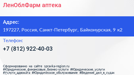ЛенОблФарм, аптека по адресу 197227, Россия, Санкт-Петербург, Байконурская, 9 к2 в дальнейшем Организация, размещена в следующих категориях: