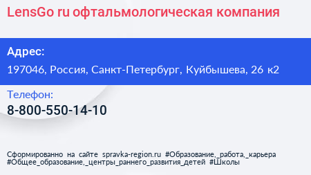 LensGo.ru, офтальмологическая компания по адресу 197046, Россия, Санкт-Петербург, Куйбышева, 26 к2 в дальнейшем Организация, размещена в следующих категориях: