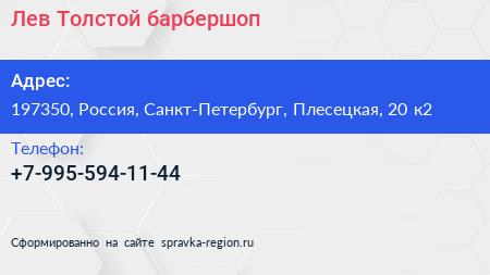 Лев Толстой, барбершоп по адресу 197350, Россия, Санкт-Петербург, Плесецкая, 20 к2 в дальнейшем Организация, размещена в следующих категориях: