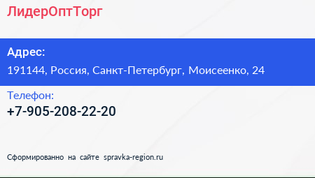 ЛидерОптТорг по адресу 191144, Россия, Санкт-Петербург, Моисеенко, 24 в дальнейшем Организация, размещена в следующих категориях: