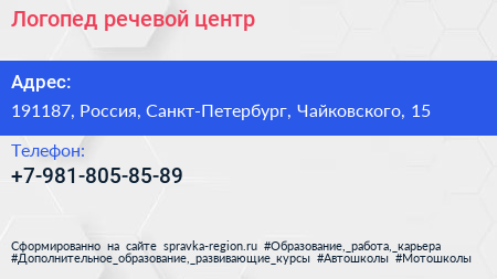 Логопед, речевой центр по адресу 191187, Россия, Санкт-Петербург, Чайковского, 15 в дальнейшем Организация, размещена в следующих категориях: