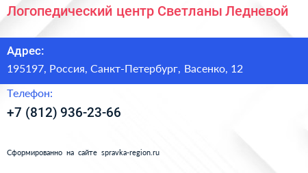 Логопедический центр Светланы Ледневой по адресу 195197, Россия, Санкт-Петербург, Васенко, 12 в дальнейшем Организация, размещена в следующих категориях: