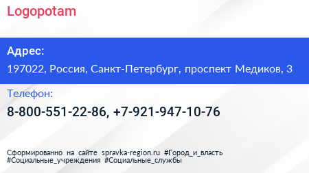 Logopotam по адресу 197022, Россия, Санкт-Петербург, проспект Медиков, 3 в дальнейшем Организация, размещена в следующих категориях: