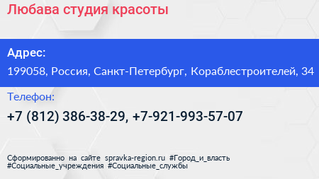 Любава, студия красоты по адресу 199058, Россия, Санкт-Петербург, Кораблестроителей, 34 в дальнейшем Организация, размещена в следующих категориях: