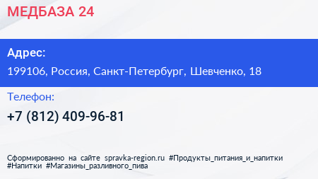 МЕДБАЗА 24 по адресу 199106, Россия, Санкт-Петербург, Шевченко, 18 в дальнейшем Организация, размещена в следующих категориях: