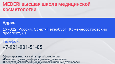 MEDERi, высшая школа медицинской косметологии по адресу 197022, Россия, Санкт-Петербург, Каменноостровский проспект, 61 в дальнейшем Организация, размещена в следующих категориях: