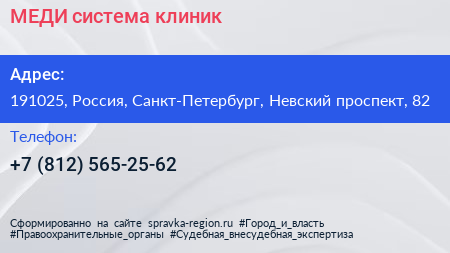МЕДИ, система клиник по адресу 191025, Россия, Санкт-Петербург, Невский проспект, 82 в дальнейшем Организация, размещена в следующих категориях: