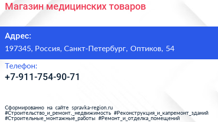 Магазин медицинских товаров по адресу 197345, Россия, Санкт-Петербург, Оптиков, 54 в дальнейшем Организация, размещена в следующих категориях: