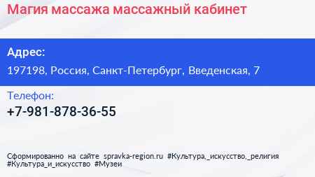 Магия массажа, массажный кабинет по адресу 197198, Россия, Санкт-Петербург, Введенская, 7 в дальнейшем Организация, размещена в следующих категориях: