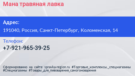 Мана, травяная лавка по адресу 191040, Россия, Санкт-Петербург, Коломенская, 14 в дальнейшем Организация, размещена в следующих категориях: