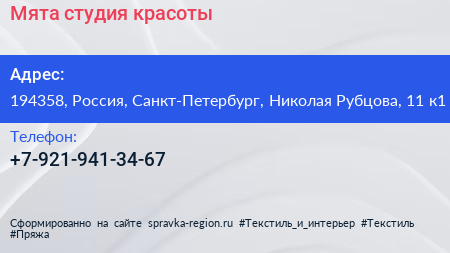 Мята, студия красоты по адресу 194358, Россия, Санкт-Петербург, Николая Рубцова, 11 к1 в дальнейшем Организация, размещена в следующих категориях: