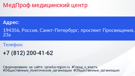 МедПроф, медицинский центр по адресу 194356, Россия, Санкт-Петербург, проспект Просвещения, 23а в дальнейшем Организация, размещена в следующих категориях: