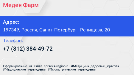 Медея Фарм по адресу 197349, Россия, Санкт-Петербург, Репищева, 20 в дальнейшем Организация, размещена в следующих категориях: