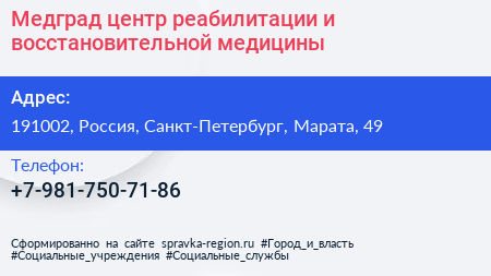 Медград, центр реабилитации и восстановительной медицины по адресу 191002, Россия, Санкт-Петербург, Марата, 49 в дальнейшем Организация, размещена в следующих категориях: