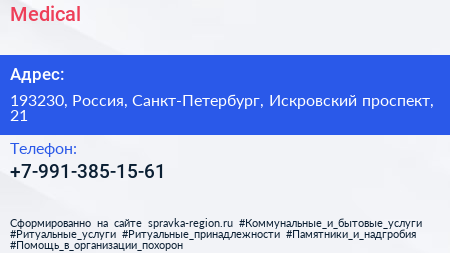 Medical по адресу 193230, Россия, Санкт-Петербург, Искровский проспект, 21 в дальнейшем Организация, размещена в следующих категориях: