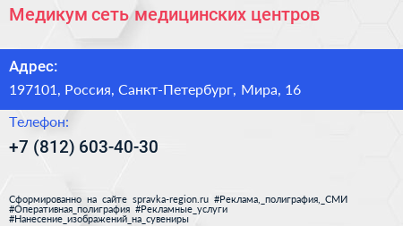 Медикум, сеть медицинских центров по адресу 197101, Россия, Санкт-Петербург, Мира, 16 в дальнейшем Организация, размещена в следующих категориях: