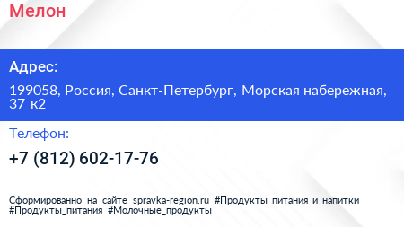 Мелон по адресу 199058, Россия, Санкт-Петербург, Морская набережная, 37 к2 в дальнейшем Организация, размещена в следующих категориях:
