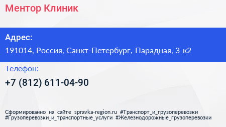 Ментор Клиник по адресу 191014, Россия, Санкт-Петербург, Парадная, 3 к2 в дальнейшем Организация, размещена в следующих категориях: