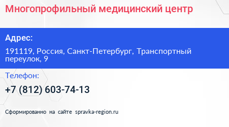 Многопрофильный медицинский центр по адресу 191119, Россия, Санкт-Петербург, Транспортный переулок, 9 в дальнейшем Организация, размещена в следующих категориях:
