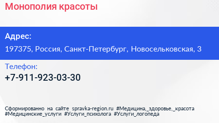 Монополия красоты по адресу 197375, Россия, Санкт-Петербург, Новосельковская, 3 в дальнейшем Организация, размещена в следующих категориях: