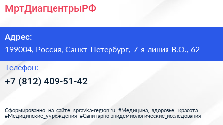МртДиагцентрыРФ по адресу 199004, Россия, Санкт-Петербург, 7-я линия В.О., 62 в дальнейшем Организация, размещена в следующих категориях: