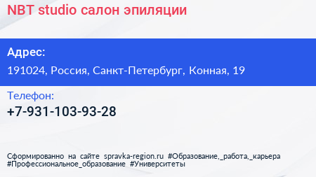 NBT studio, салон эпиляции по адресу 191024, Россия, Санкт-Петербург, Конная, 19 в дальнейшем Организация, размещена в следующих категориях:
