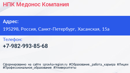НПК Медонос, Компания по адресу 195298, Россия, Санкт-Петербург, Хасанская, 15а в дальнейшем Организация, размещена в следующих категориях: