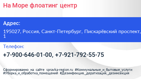 На Море, флоатинг-центр по адресу 195027, Россия, Санкт-Петербург, Пискарёвский проспект, 1 в дальнейшем Организация, размещена в следующих категориях: