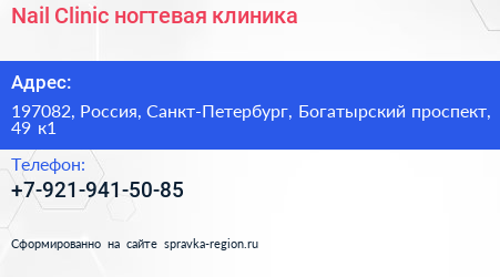 Nail Clinic, ногтевая клиника по адресу 197082, Россия, Санкт-Петербург, Богатырский проспект, 49 к1 в дальнейшем Организация, размещена в следующих категориях: