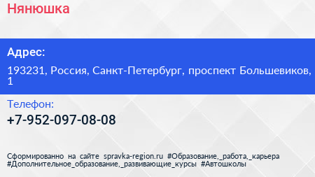 Нянюшка по адресу 193231, Россия, Санкт-Петербург, проспект Большевиков, 1 в дальнейшем Организация, размещена в следующих категориях: