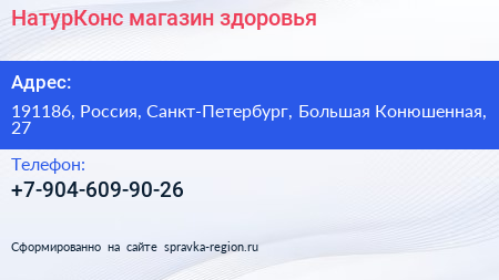 НатурКонс, магазин здоровья по адресу 191186, Россия, Санкт-Петербург, Большая Конюшенная, 27 в дальнейшем Организация, размещена в следующих категориях: