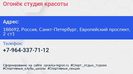 Огонёк, студия красоты по адресу 188692, Россия, Санкт-Петербург, Европейский проспект, 2 ст1 в дальнейшем Организация, размещена в следующих категориях: