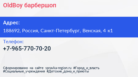 OldBoy, барбершоп по адресу 188692, Россия, Санкт-Петербург, Венская, 4 к1 в дальнейшем Организация, размещена в следующих категориях: