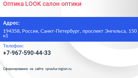 Оптика LOOK, салон оптики по адресу 194358, Россия, Санкт-Петербург, проспект Энгельса, 150 к1 в дальнейшем Организация, размещена в следующих категориях: