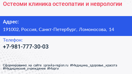 Остеоми, клиника остеопатии и неврологии по адресу 191002, Россия, Санкт-Петербург, Ломоносова, 14 в дальнейшем Организация, размещена в следующих категориях: