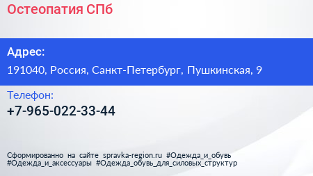 Остеопатия СПб по адресу 191040, Россия, Санкт-Петербург, Пушкинская, 9 в дальнейшем Организация, размещена в следующих категориях: