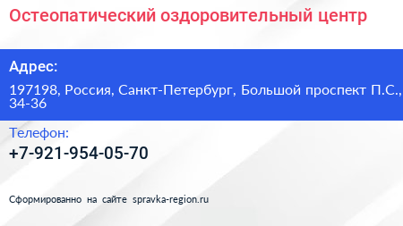 Остеопатический оздоровительный центр по адресу 197198, Россия, Санкт-Петербург, Большой проспект П.С., 34-36 в дальнейшем Организация, размещена в следующих категориях: