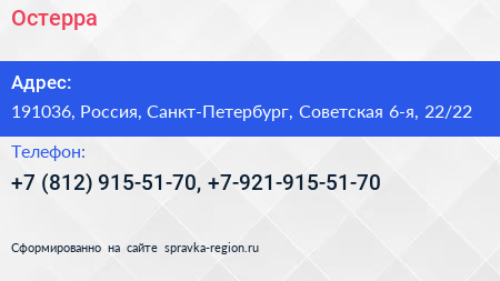 Остерра по адресу 191036, Россия, Санкт-Петербург, Советская 6-я, 22/22 в дальнейшем Организация, размещена в следующих категориях:
