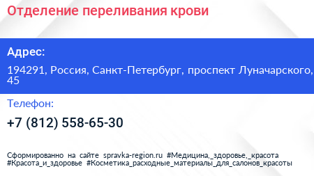 Отделение переливания крови по адресу 194291, Россия, Санкт-Петербург, проспект Луначарского, 45 в дальнейшем Организация, размещена в следующих категориях: