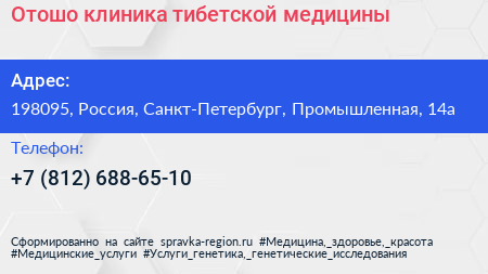 Отошо, клиника тибетской медицины по адресу 198095, Россия, Санкт-Петербург, Промышленная, 14а в дальнейшем Организация, размещена в следующих категориях: